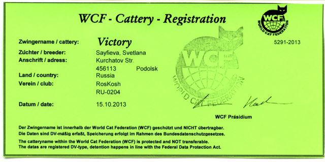 Питомник находится в Подольске — самом большом городе Московской области, и зарегистрирован по системе WCF 15.10.2013 г., номер 5291-2013.