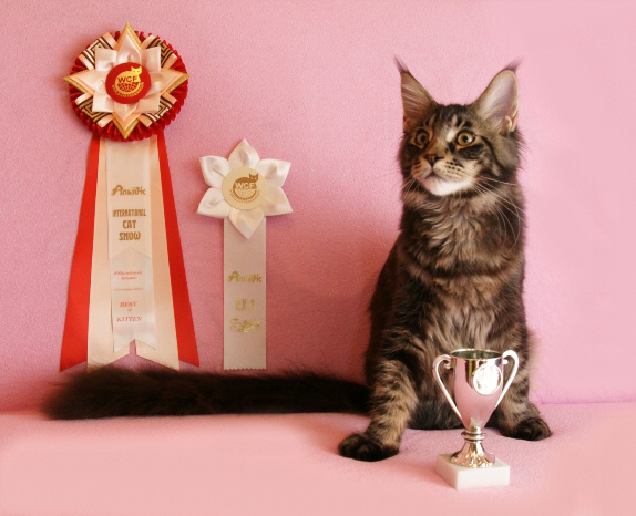 Артур на самой первой своей выставке «Юбилейный Альянс – 2010», проходившей 13-14 ноября 2010 года, в г. Москве, малыш получил свои первые Ex.1 от Натальи Лебедевой, Ex.1 и Nom Bis от Елены Федоренко, стал Веst kitten of breed на монопородном шоу мейн-кунов!