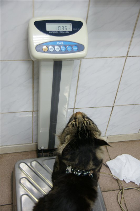 Забегая вперед, скажу, что максимальный нетто-вес кота (10500) был зафиксирован на бесстрастных весах аэропорта Домодедово, когда мы с ним летели в Омск закрывать ЧМ. Летом 2013 г. в клинике Доктор Гав в возрасте 3 года наш вес составил 10350!