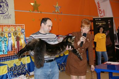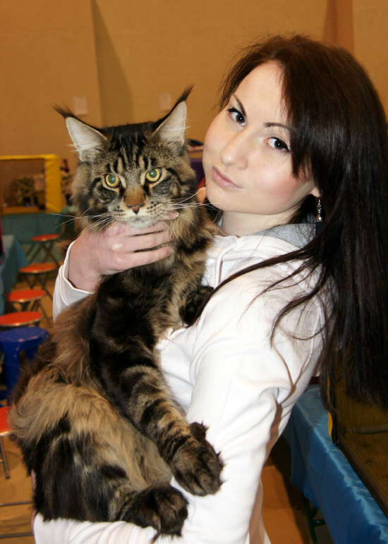 Эта выставка осталась в нашей памяти еще и благодаря весьма интересному событию. Как известно, очень много мифов ходит вокруг веса мейн-кунов. Пытаясь развенчать рассказы заводчиков о весе их животных, превышающих 12-15 кг, инициативная группа на этой выставке ходила с весами, взвешивала и фиксировала вес животных. У нас остался фотофакт, что в возрасте 10,5 месяцев Артур весил 8440.
