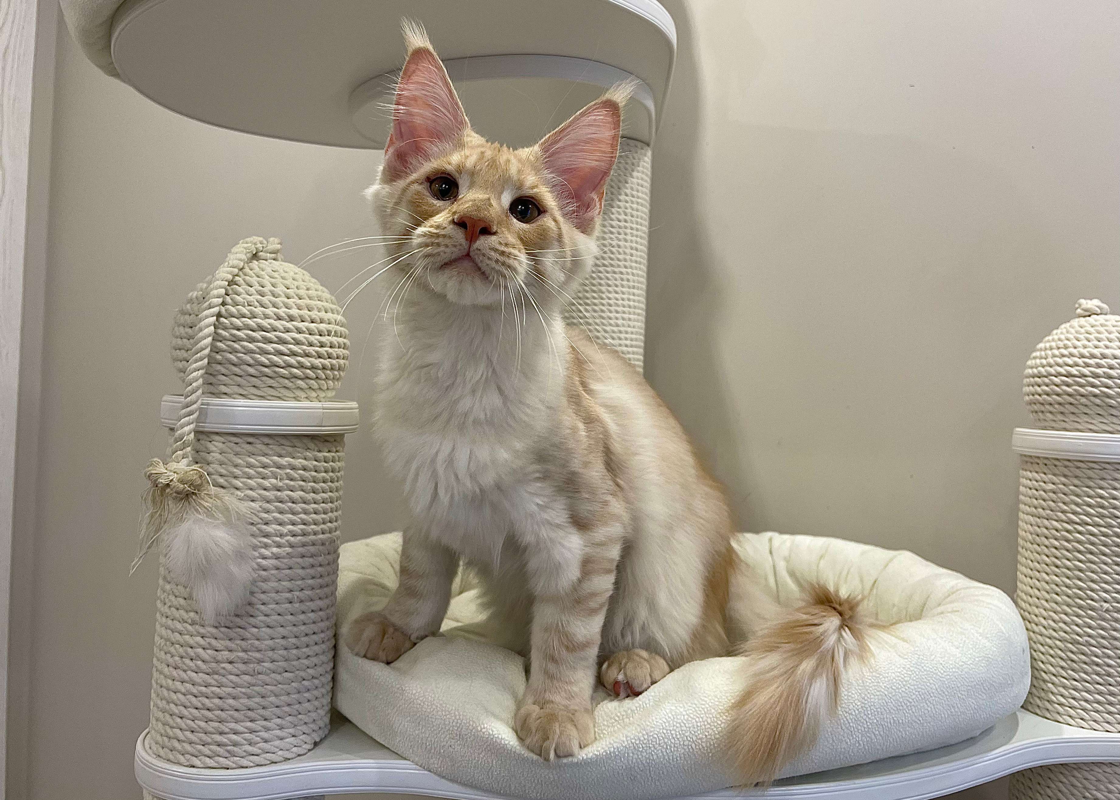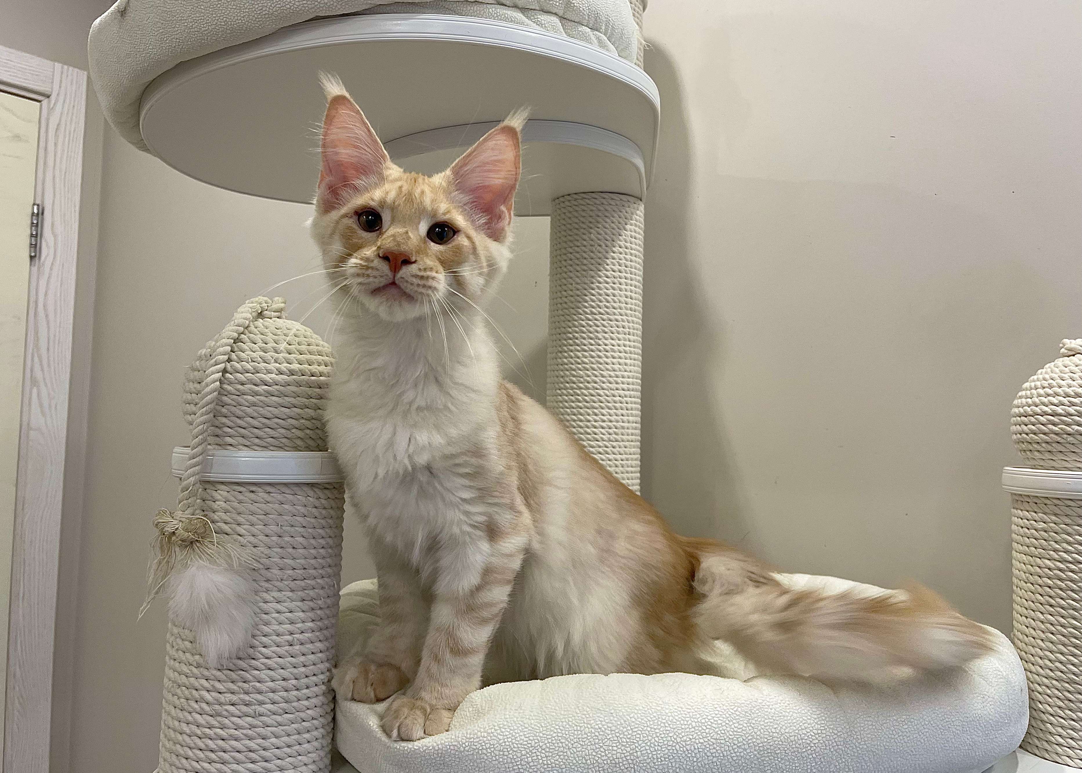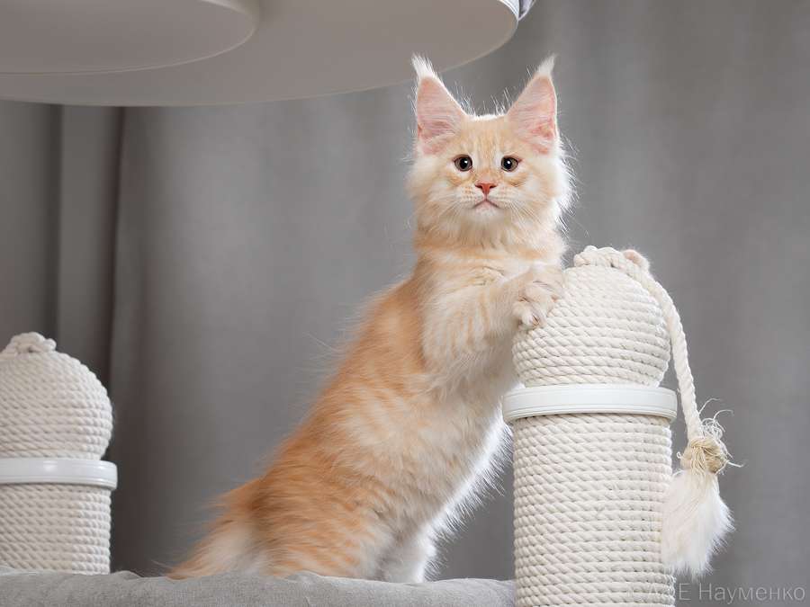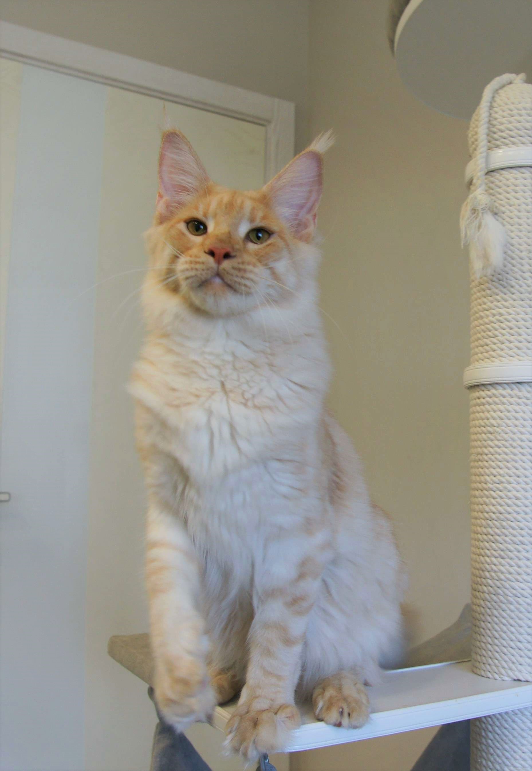 Такой окрас для нас дебют. Чистейший белоснежный подшерсток, дымный воротник, белые кисти, сверху нежное кремовое облако. Представляете, когда котяра вырастет? Значение имени подстать: "победитель, чемпион".