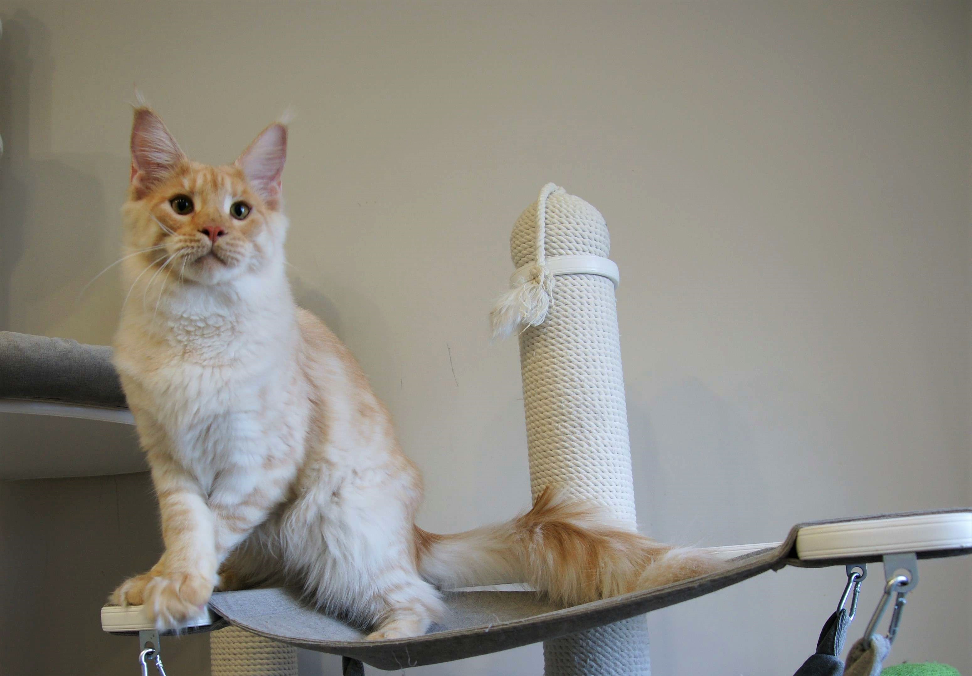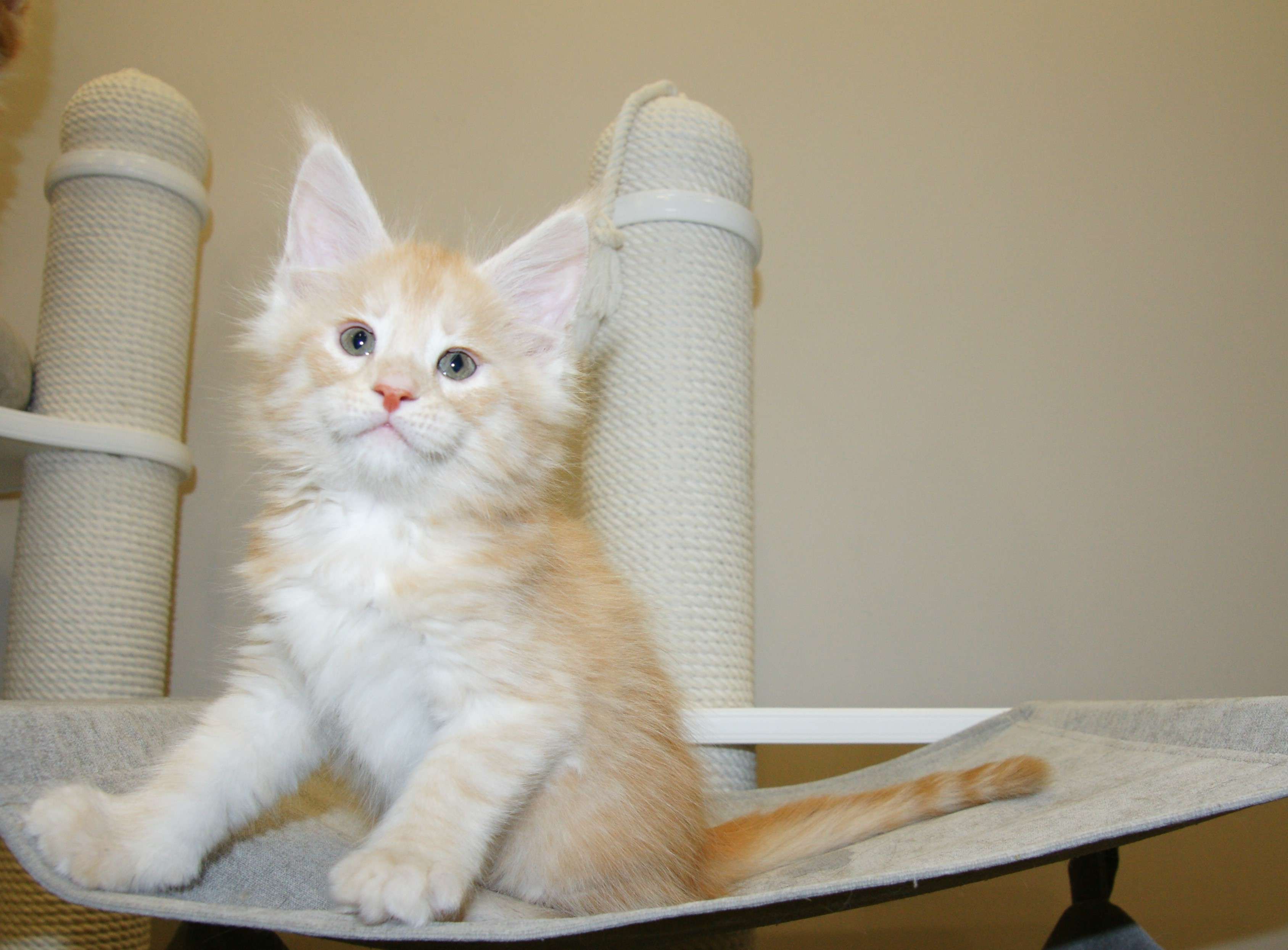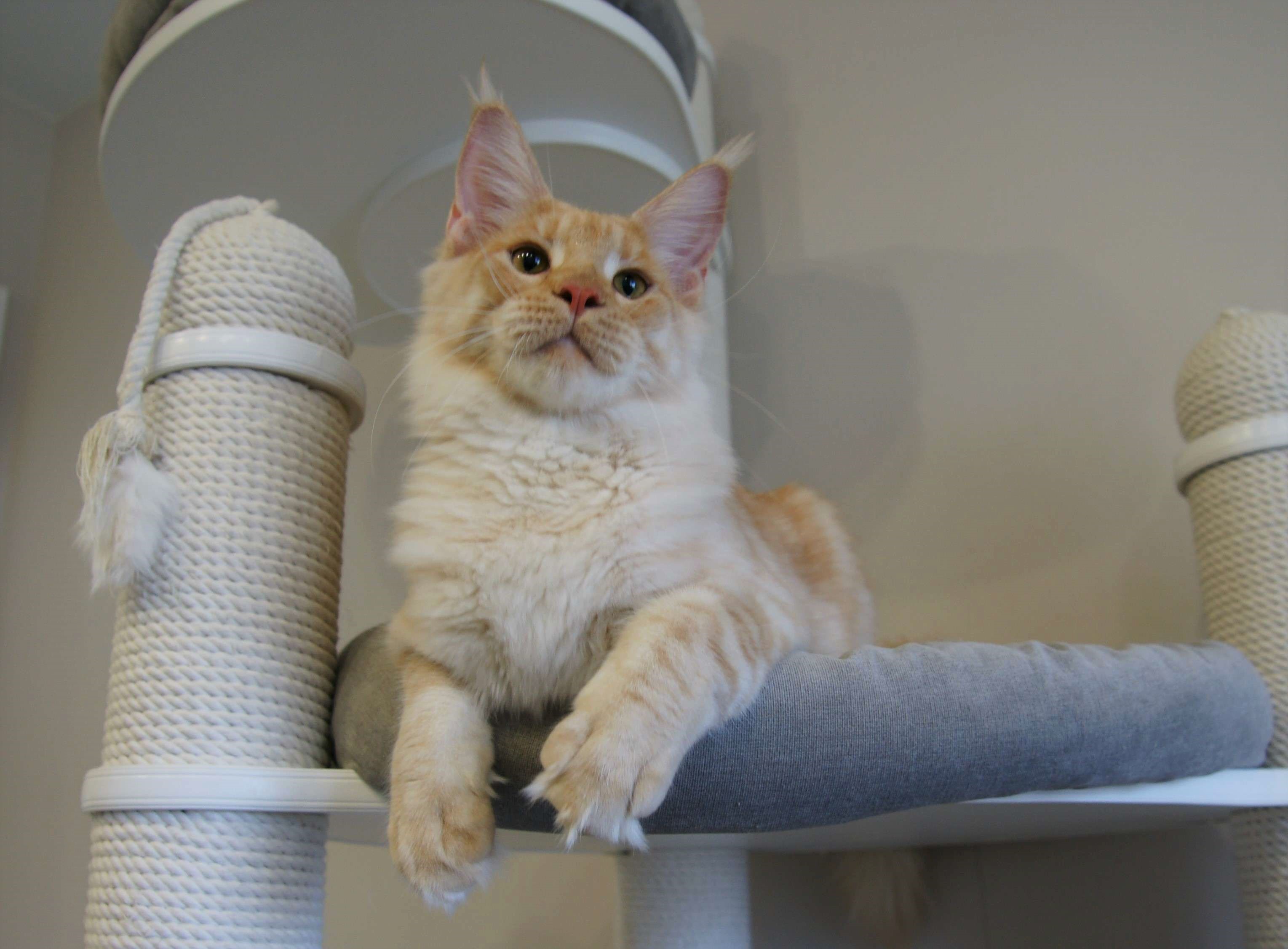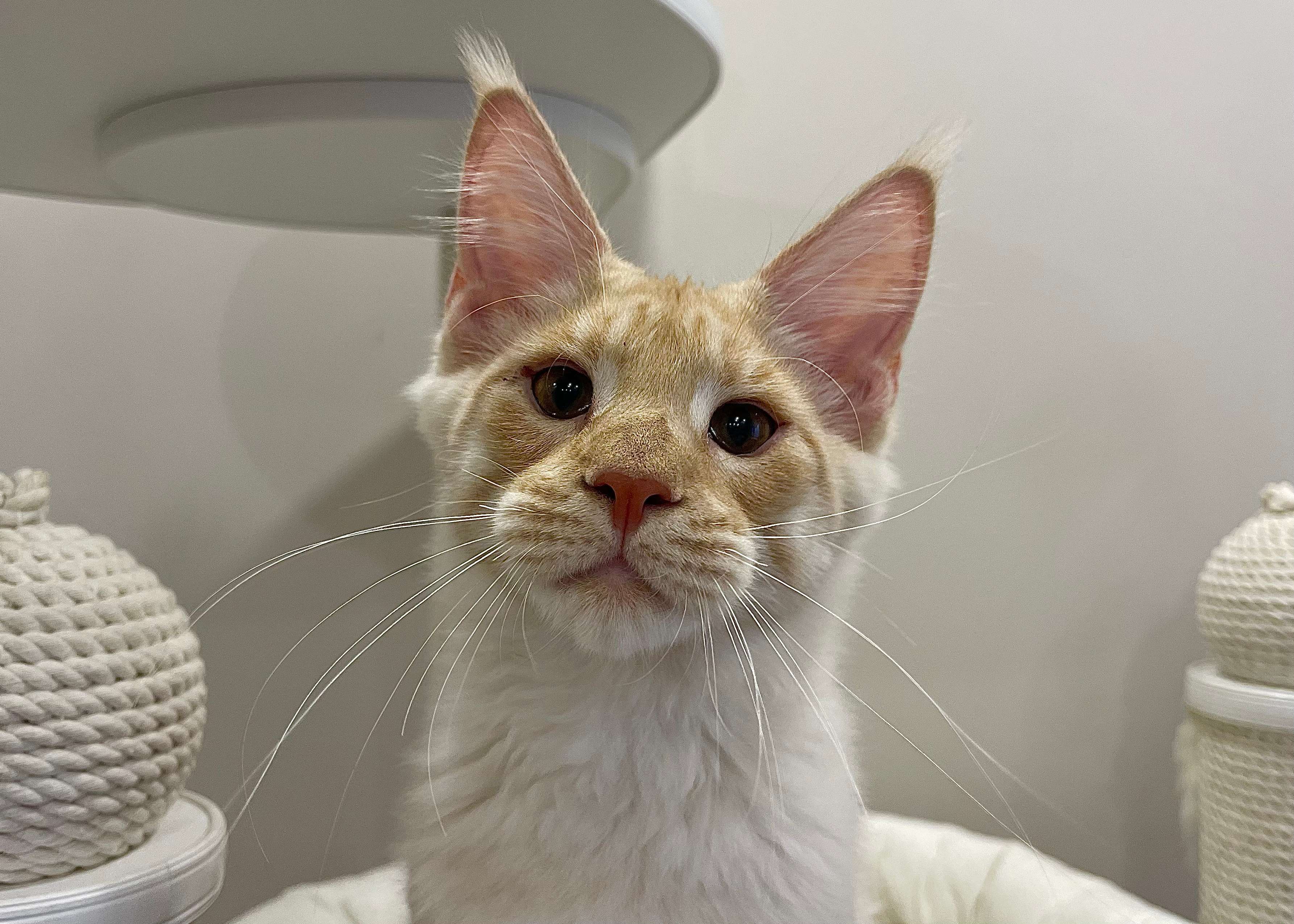 Такой окрас для нас дебют. Чистейший белоснежный подшерсток, дымный воротник, белые кисти, сверху нежное кремовое облако. Представляете, когда котяра вырастет? Значение имени подстать: "победитель, чемпион".