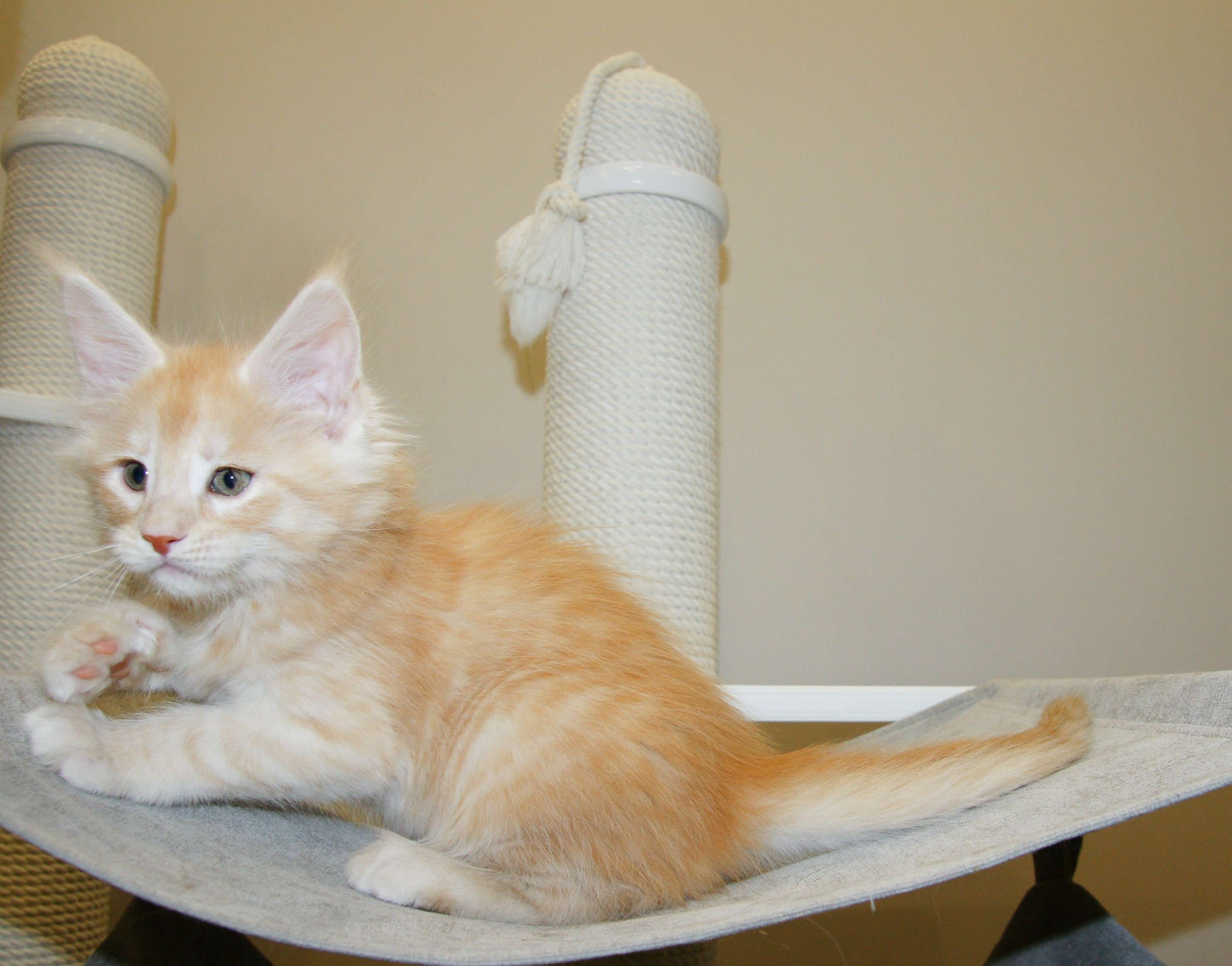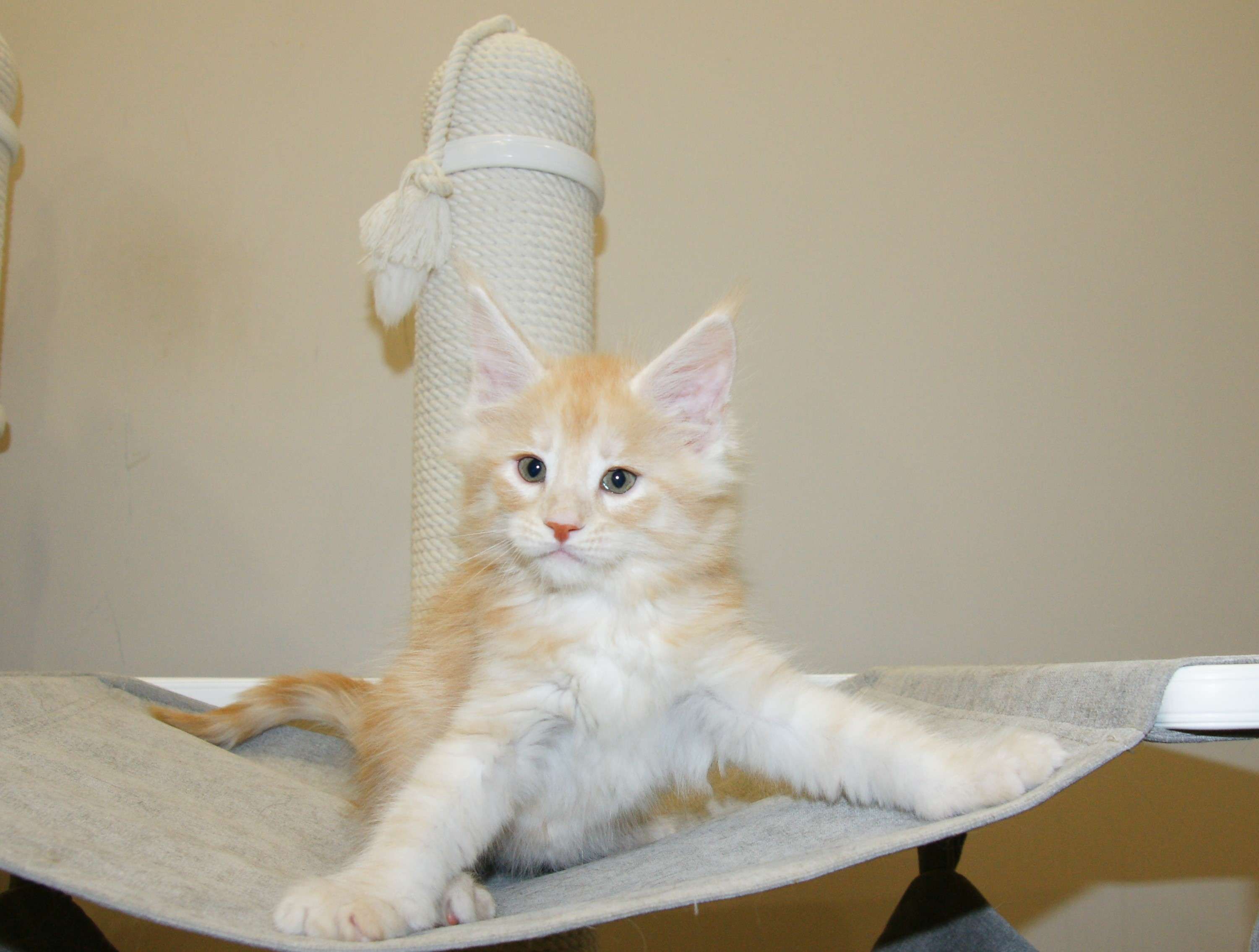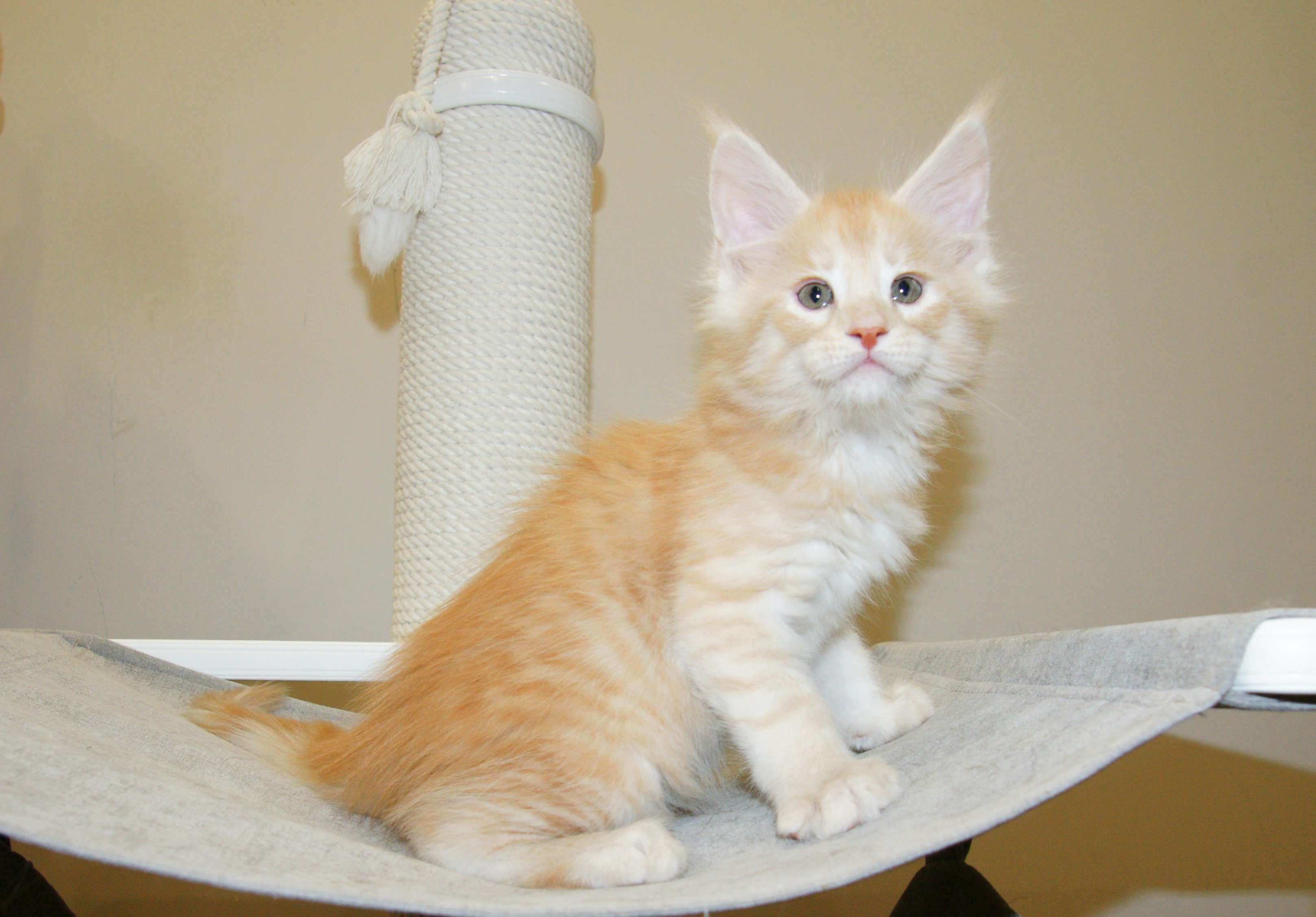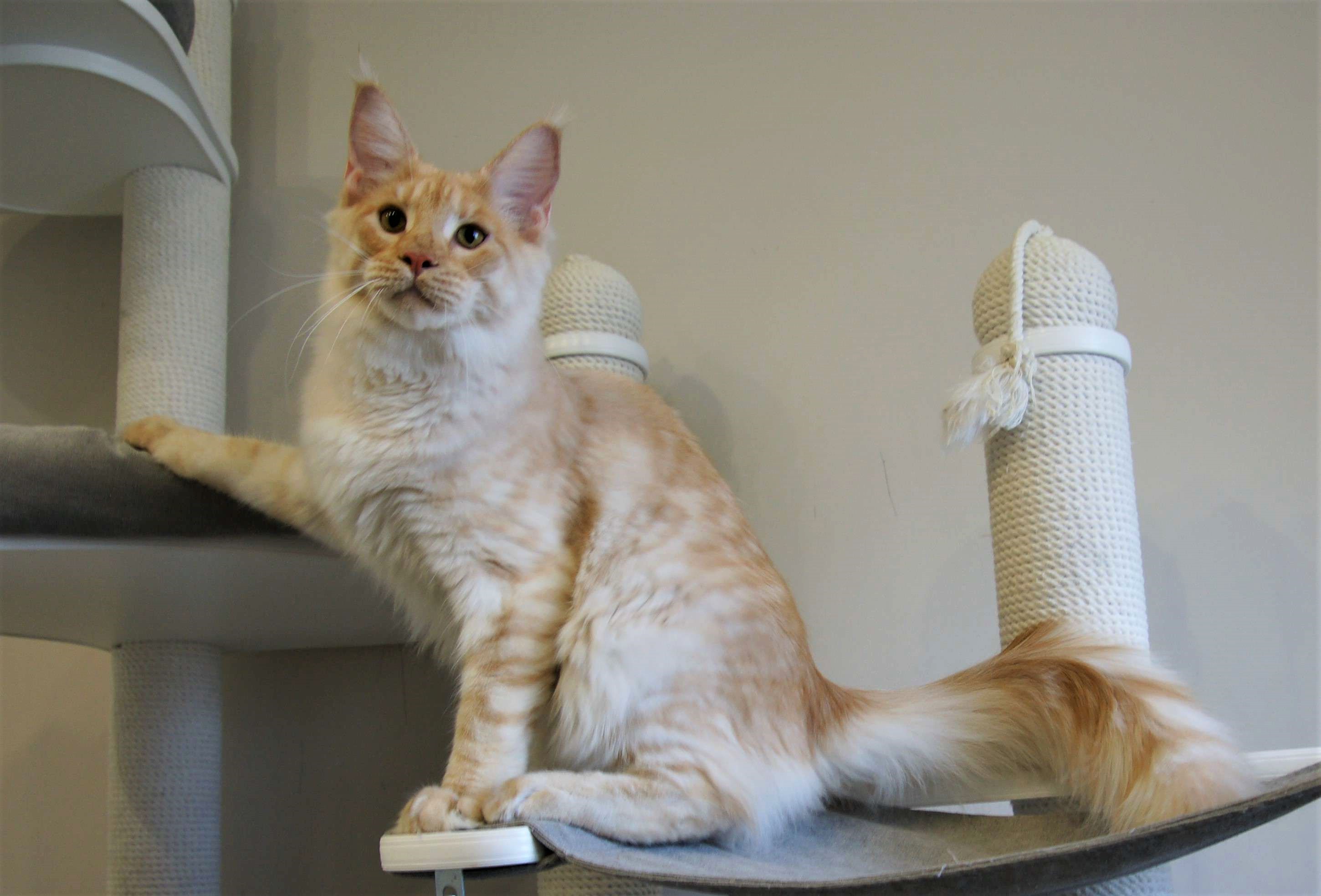Такой окрас для нас дебют. Чистейший белоснежный подшерсток, дымный воротник, белые кисти, сверху нежное кремовое облако. Представляете, когда котяра вырастет? Значение имени подстать: "победитель, чемпион".